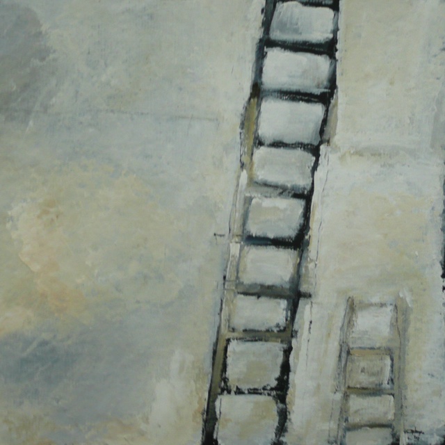 In Gaby’s eerste periode als schilder is het surrealisme richting gevend geweest. Het werd haar eigen magisch-realistische stijl, één die zeer herkenbaar is. Desolate landschappen, die bevolkt werden door ‘fantastische’ figuren en vormen. Haar kleurgebruik is dan nog enigszins gedekt: zandkleuren en blauwen. Minutieus schilderen in olieverf en tekenen met potlood op verschillende dragers. De basiskennis van het tekenen is voor haar essentieel. Een compositie, een figuur staat of valt met de juiste opbouw.